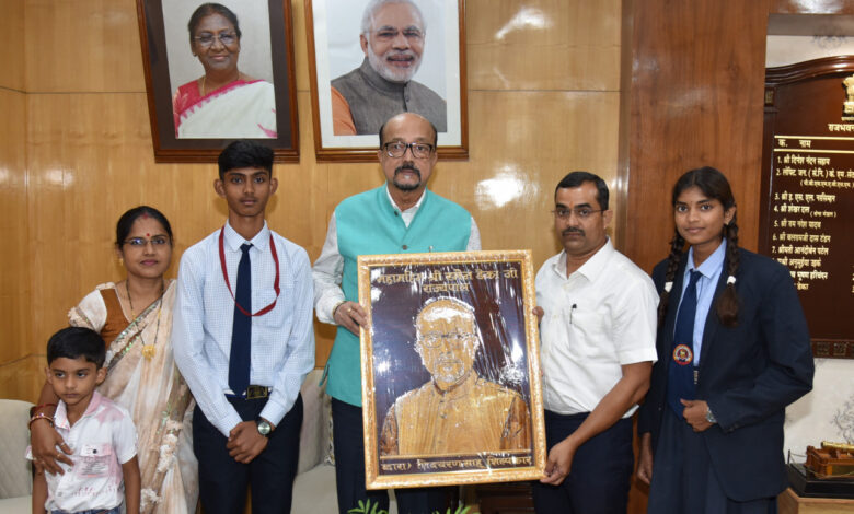 राज्यपाल श्री डेका को मड़ानार स्कूल के बच्चों ने काष्ठ कला से निर्मित पोट्रेट भेंट की